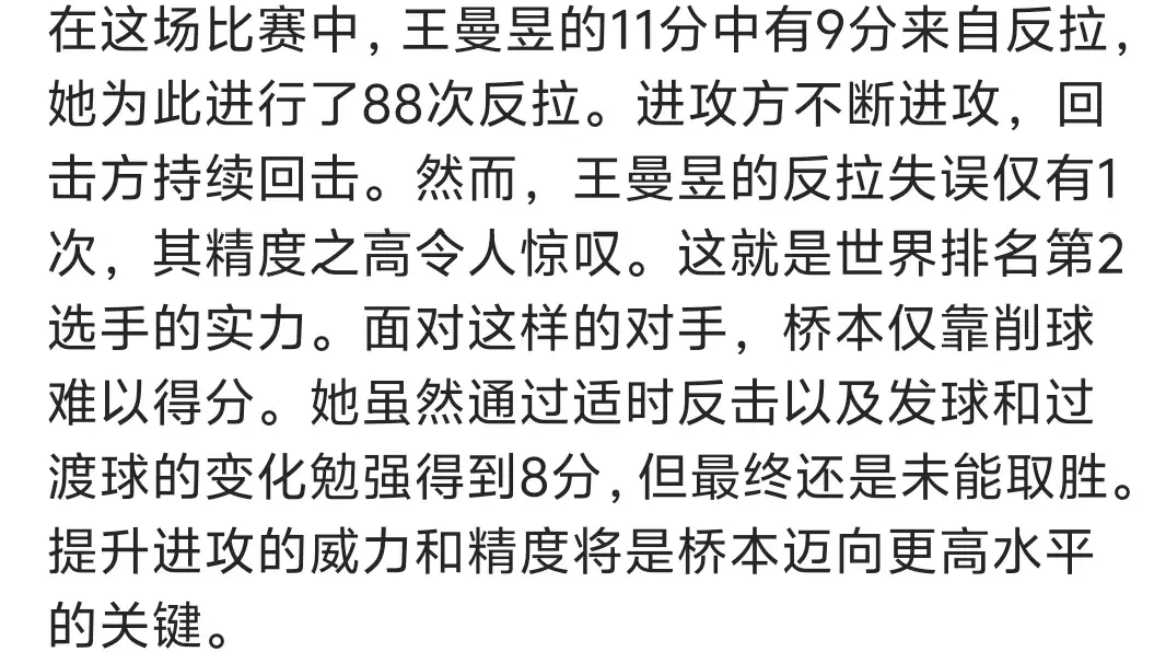 王曼昱和桥本帆乃香这场交手给很多选手提供了战术支持,因为普通选手很难拥有孙颖莎那样的正手连续进攻能力,无法在正手环节持续压制削球手。王曼昱通过长短球的结合突然进行正手发力,打出了进攻的突然性,只要选手增加技术的稳定性,对战削球手是很有把握的。